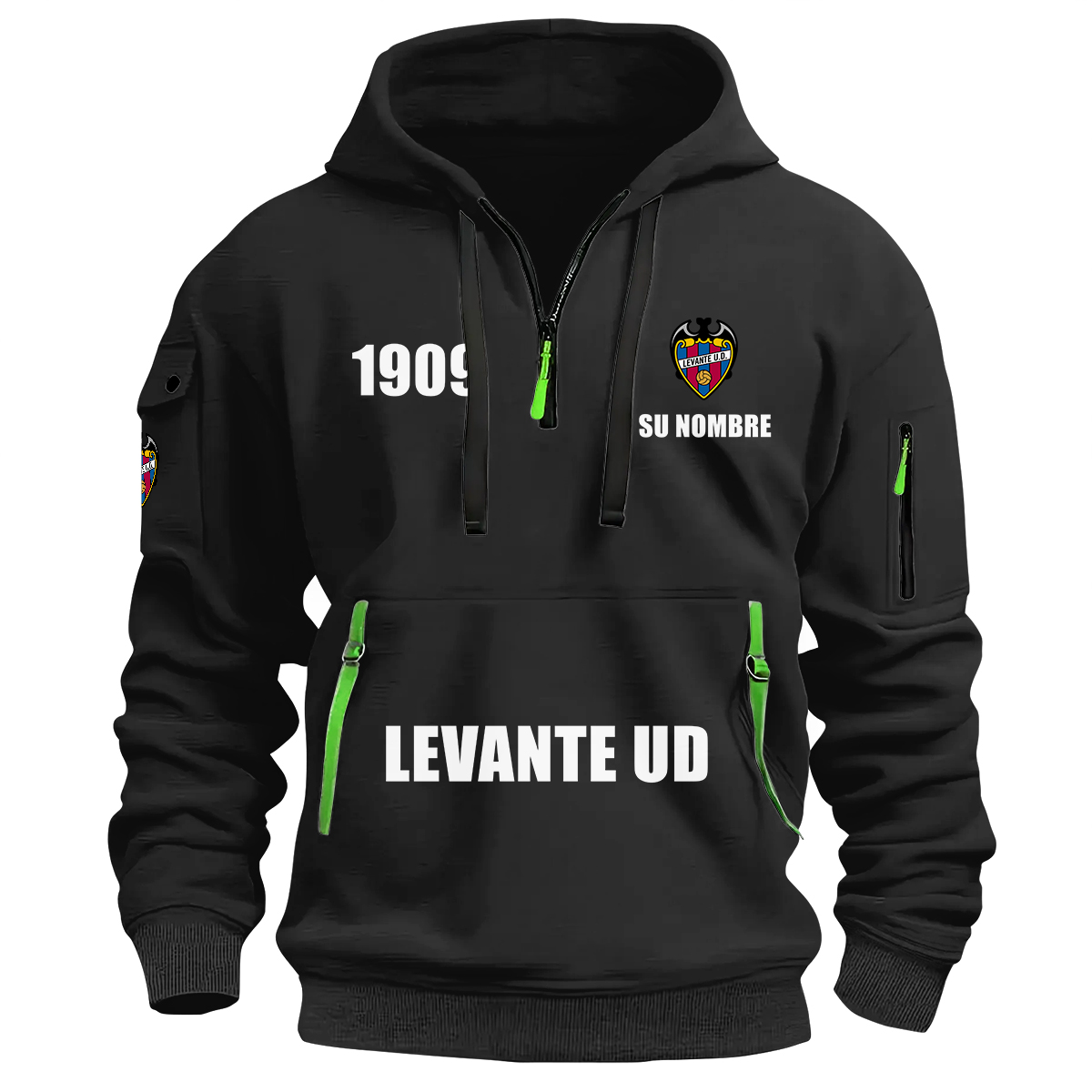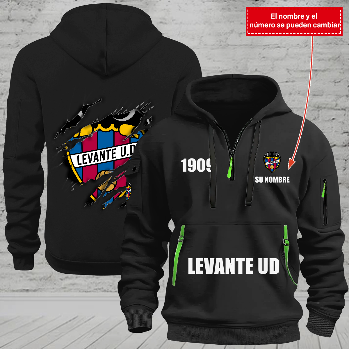 Levante UD – Sudadera con capucha y cremallera de un cuarto para hombres y mujeres: personalizada, nombre y años personalizados